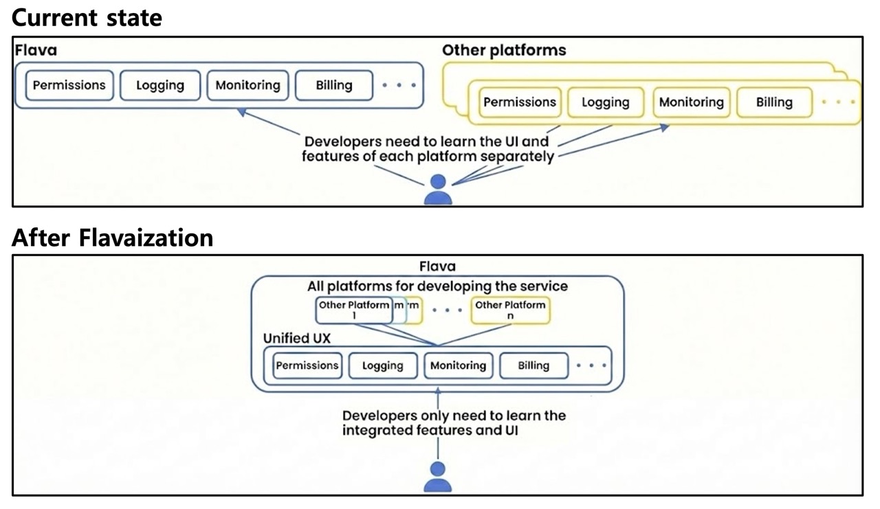 Young Hee Park表示,開發團隊所用的產品和服務,仍分散在不同的內部平臺上,目前首要任務是提供開發團隊所需的各種開發服務,並且確保可提供一致的開發體驗和共享的基礎架構,他們將這項工作稱為「平臺Flava化」,預計一到兩年可以完成大部分的工作。