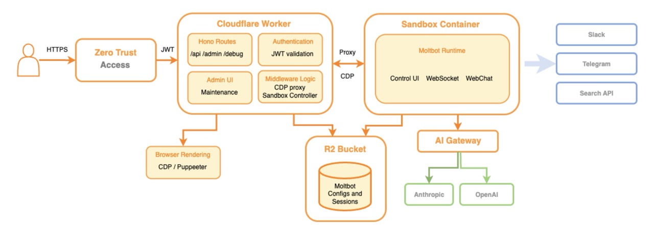 Moltworker的入口Worker,負責API路由與代理,並透過Sandbox SDK在隔離環境中啟動容器,執行Moltbot的既有閘道環境與整合項目。為了讓AI代理能執行需要瀏覽器的工作,專案也接上Cloudflare Browser Rendering,提供無頭瀏覽器能力,讓Moltbot可進行網頁操作與截圖等流程。另一方面,考量容器屬短暫執行環境,專案以R2物件儲存提供持久化資料,用於保存對話紀錄與必要的狀態檔案。